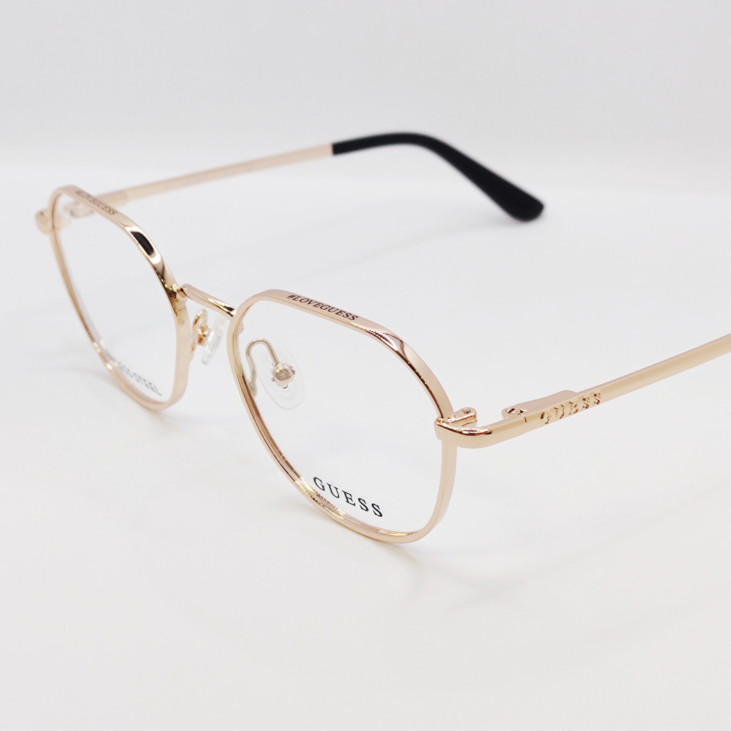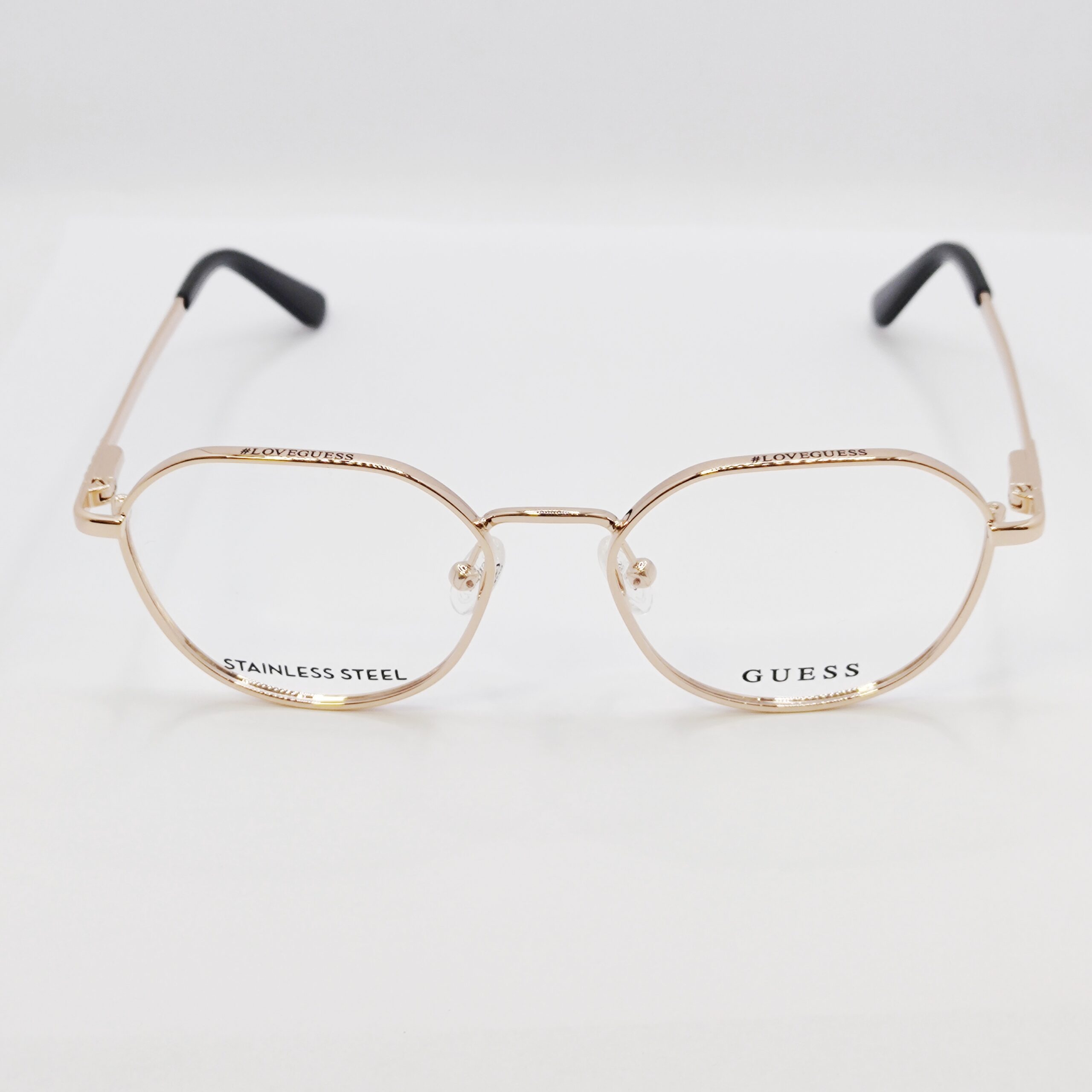 Kovinski otroški korekcijski okvir znamke Guess, ki navduši s svojo moderno obliko in zlato barvo.