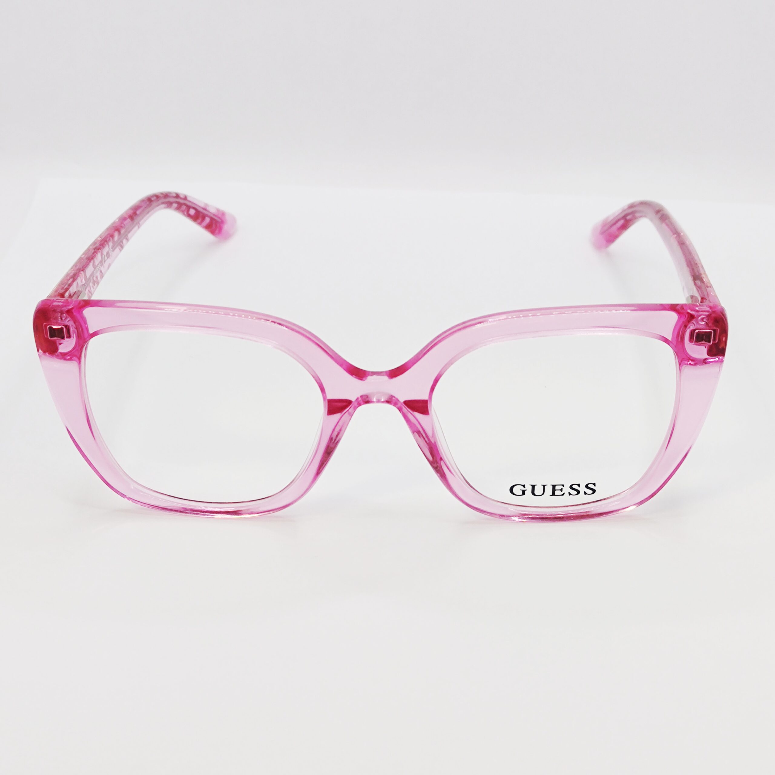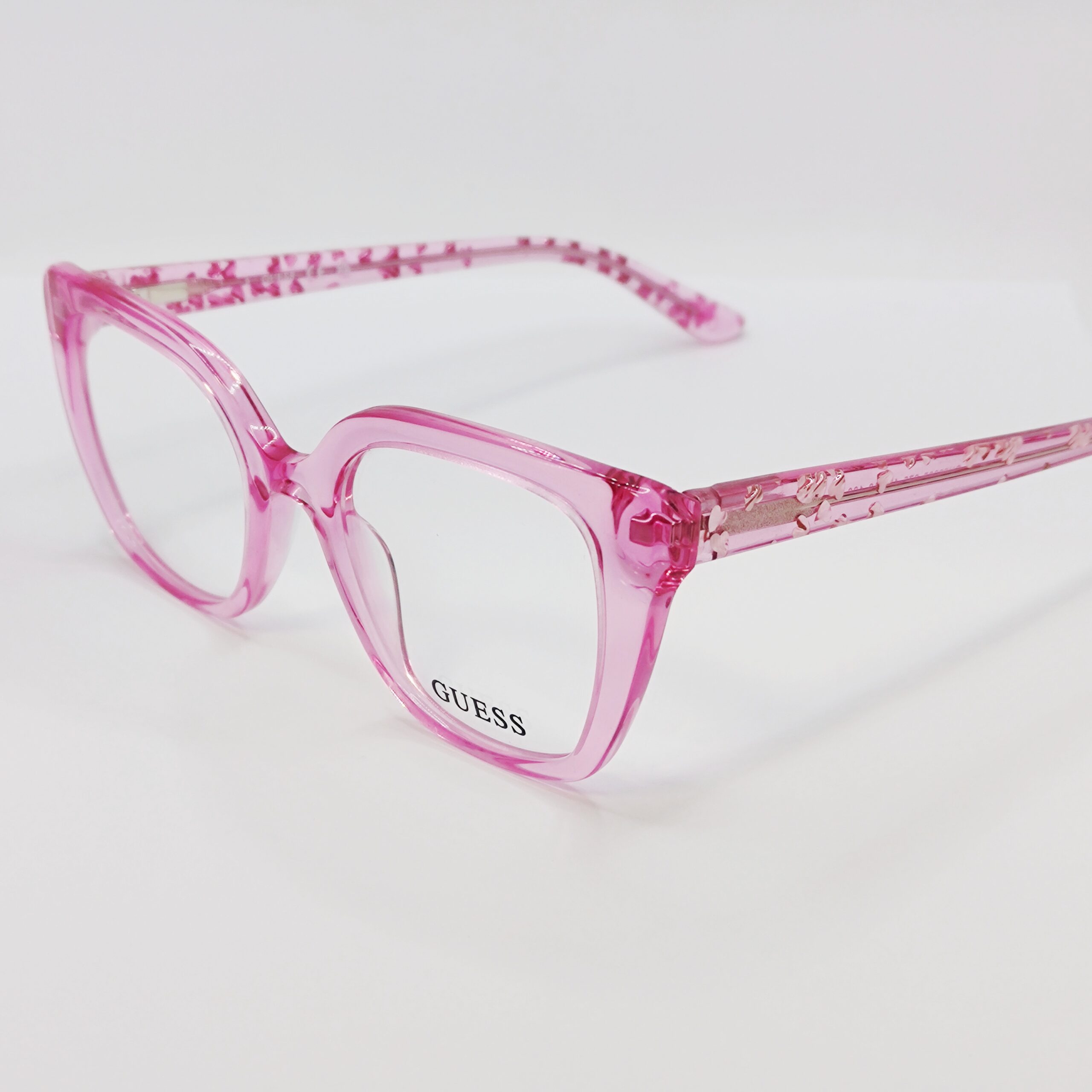 Otroški korekcijski okvir znamke Guess, transparentno roza barve. Okvir navduši z modno obliko in motivom srčkov na priponkah.