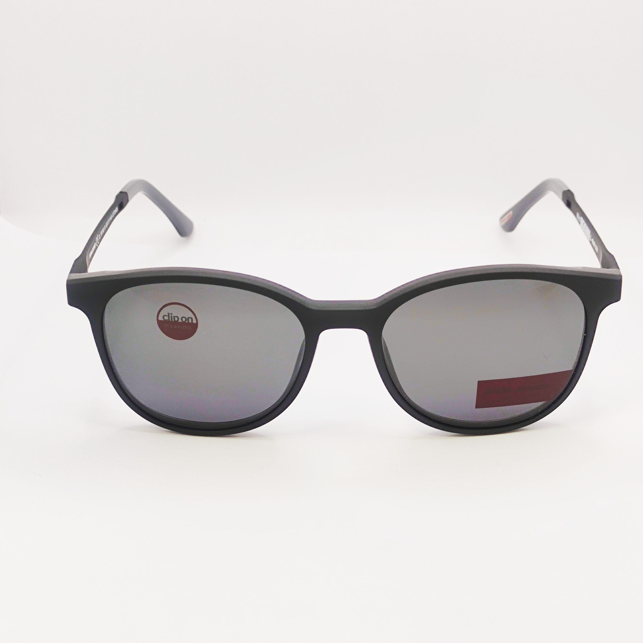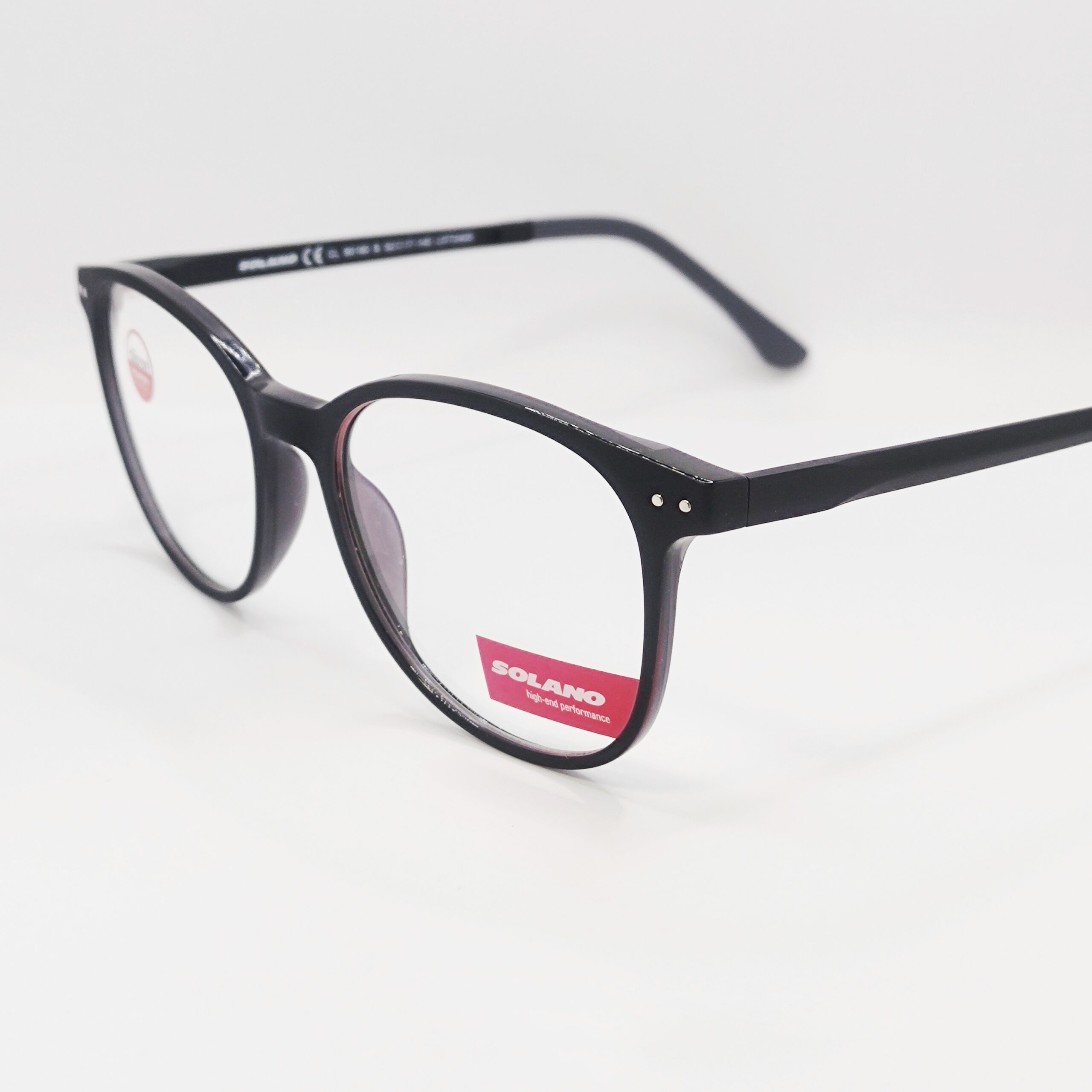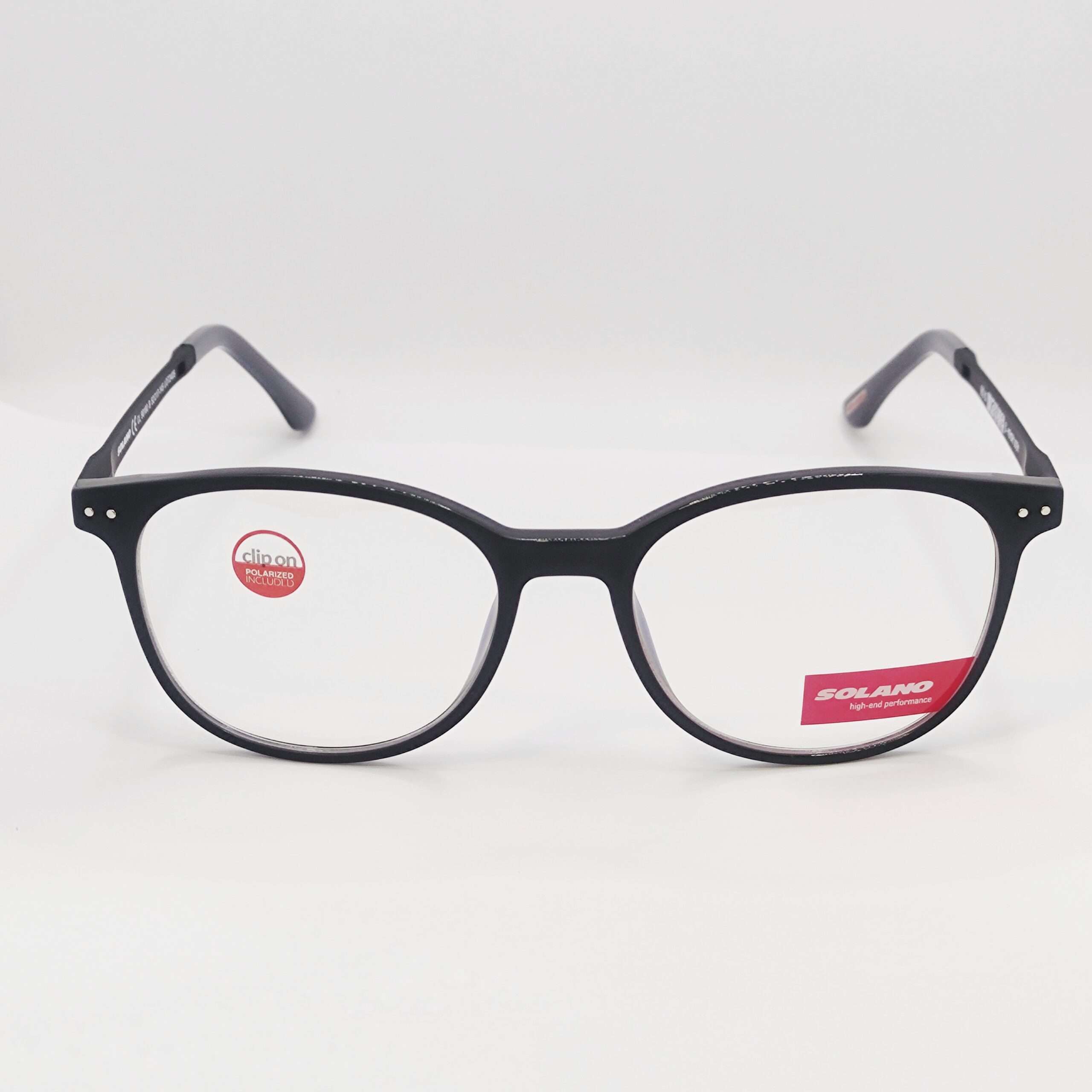 Korekcijski okvir znamke Solano s polariziranim clip-onom za sonce. Klasične črne barve. Matiran izgled.