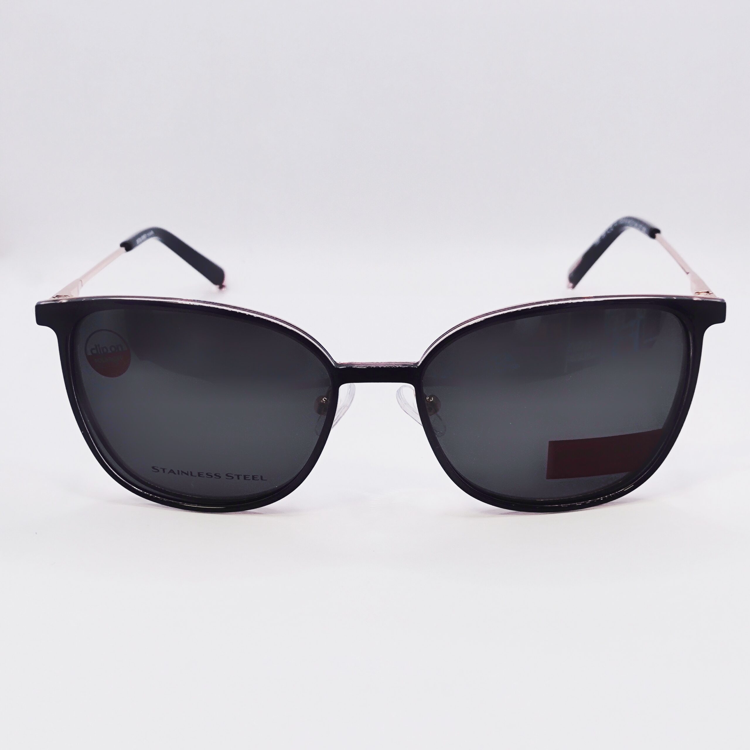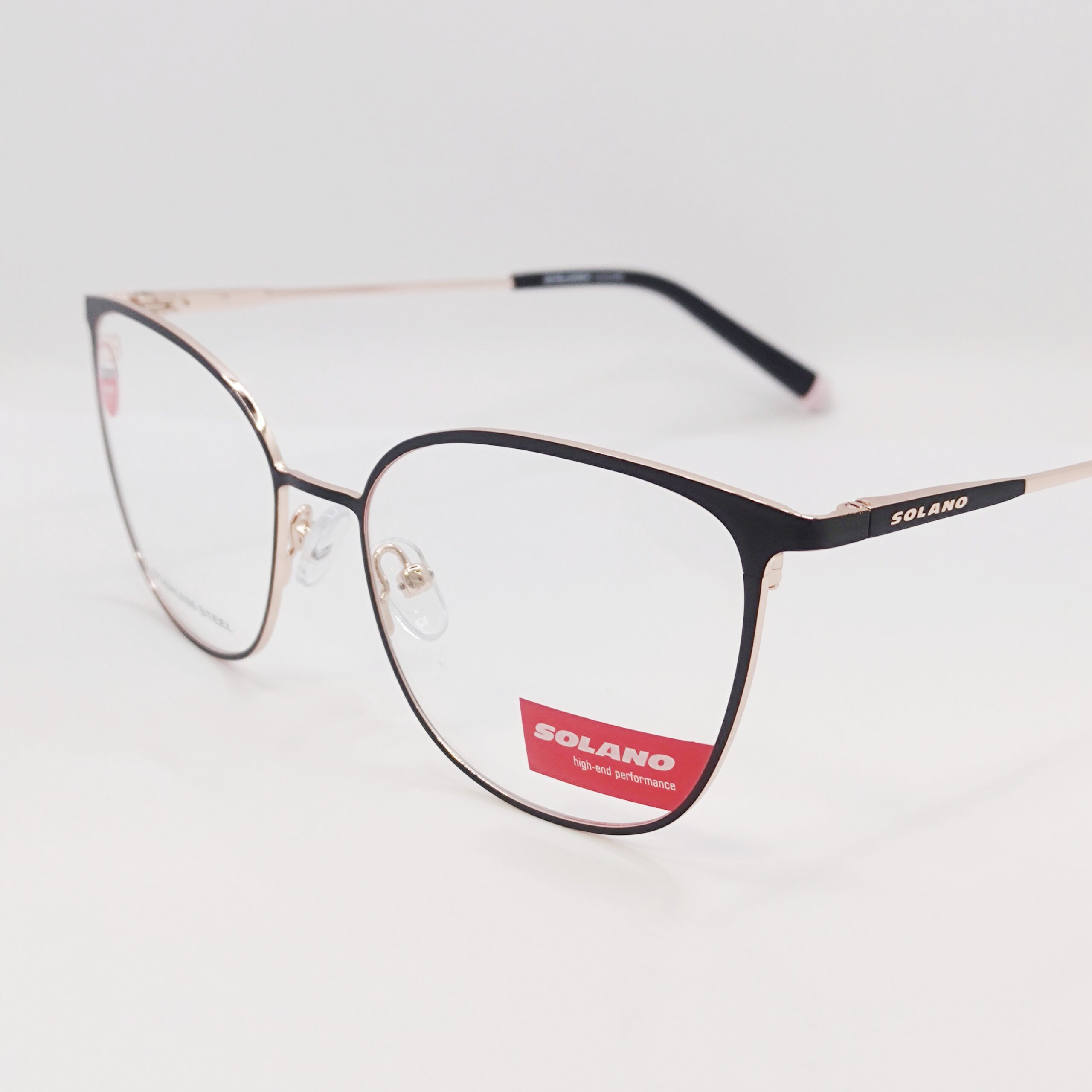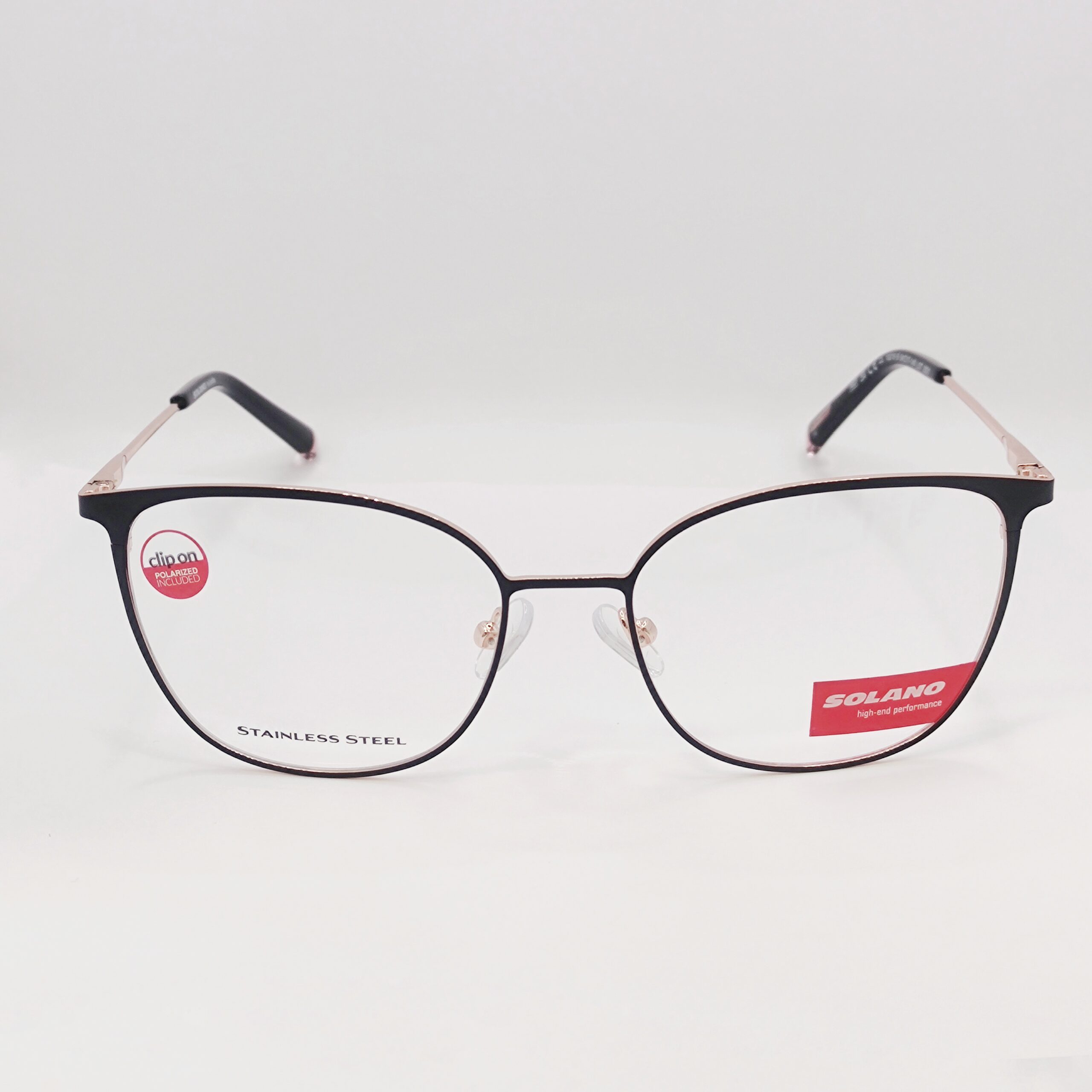 Korekcijski okvir znamke Solano s polariziranim clip-onom za sonce. Čudovita kombinacija črne in rose gold barve.