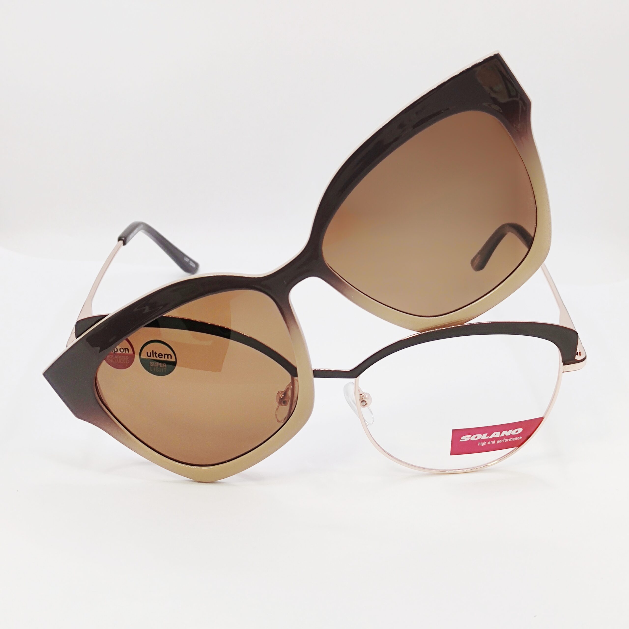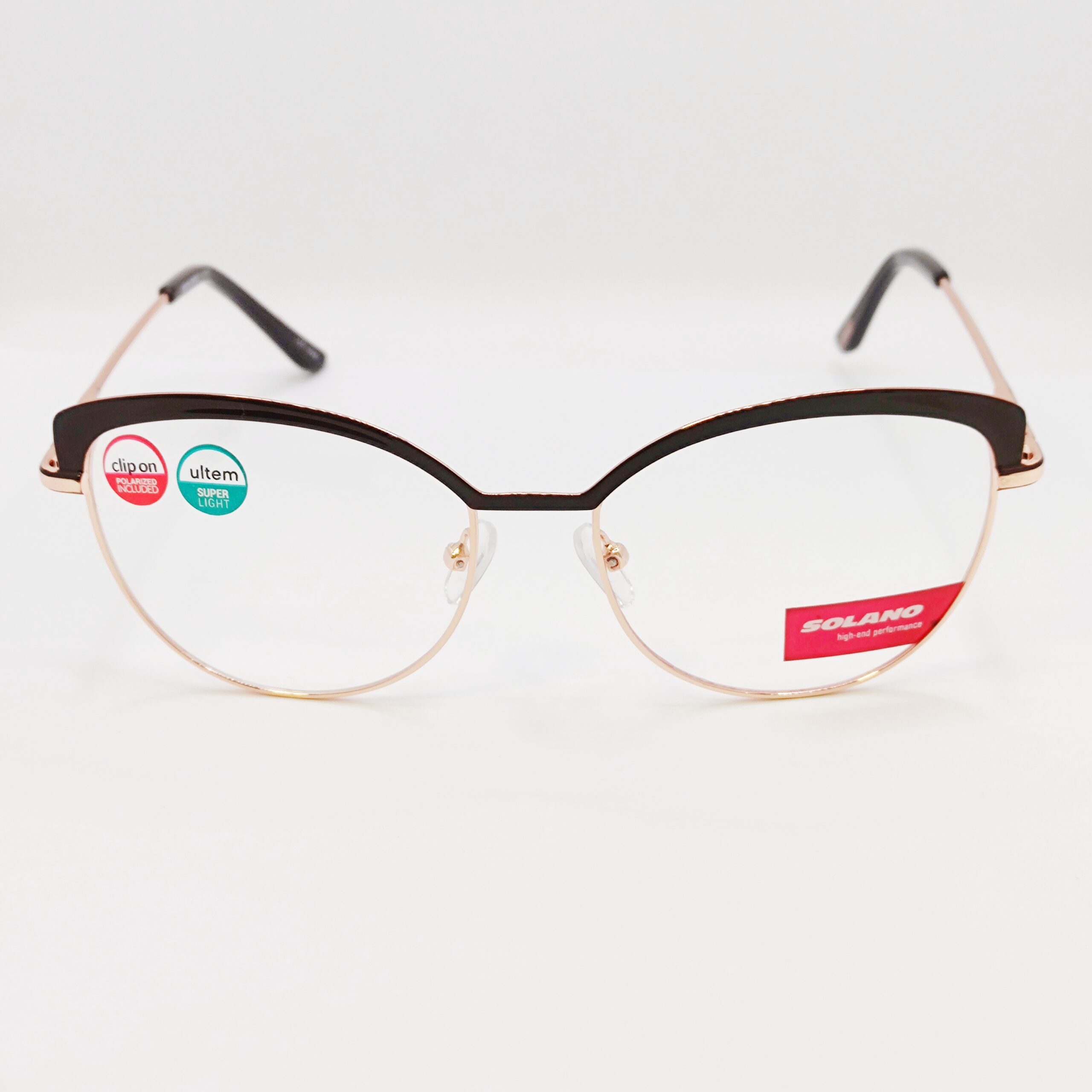 Korekcijski okvir znamke Solano z modnim polariziranim clip-onom za sonce. Lepa kombinacija rjave in rose gold barve.