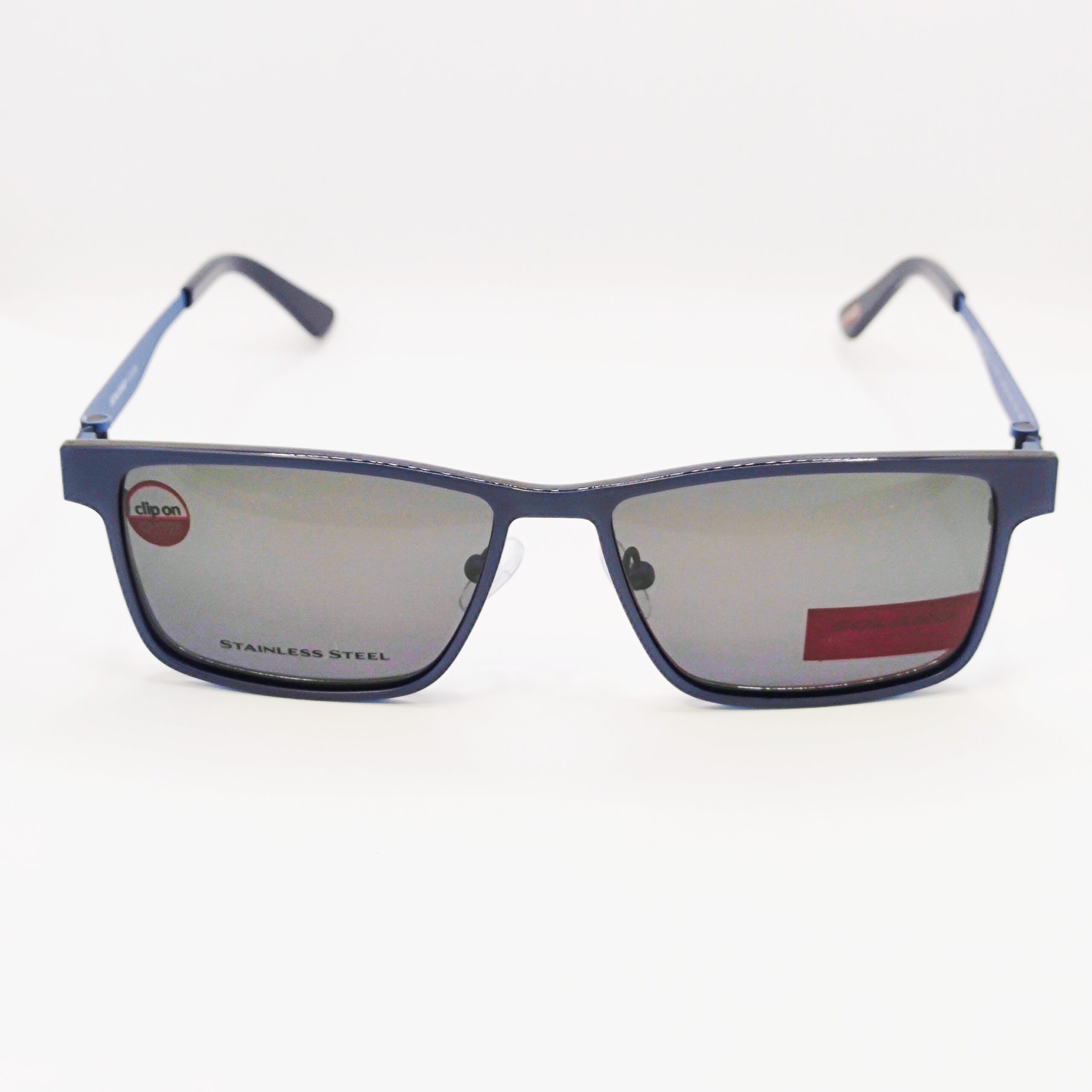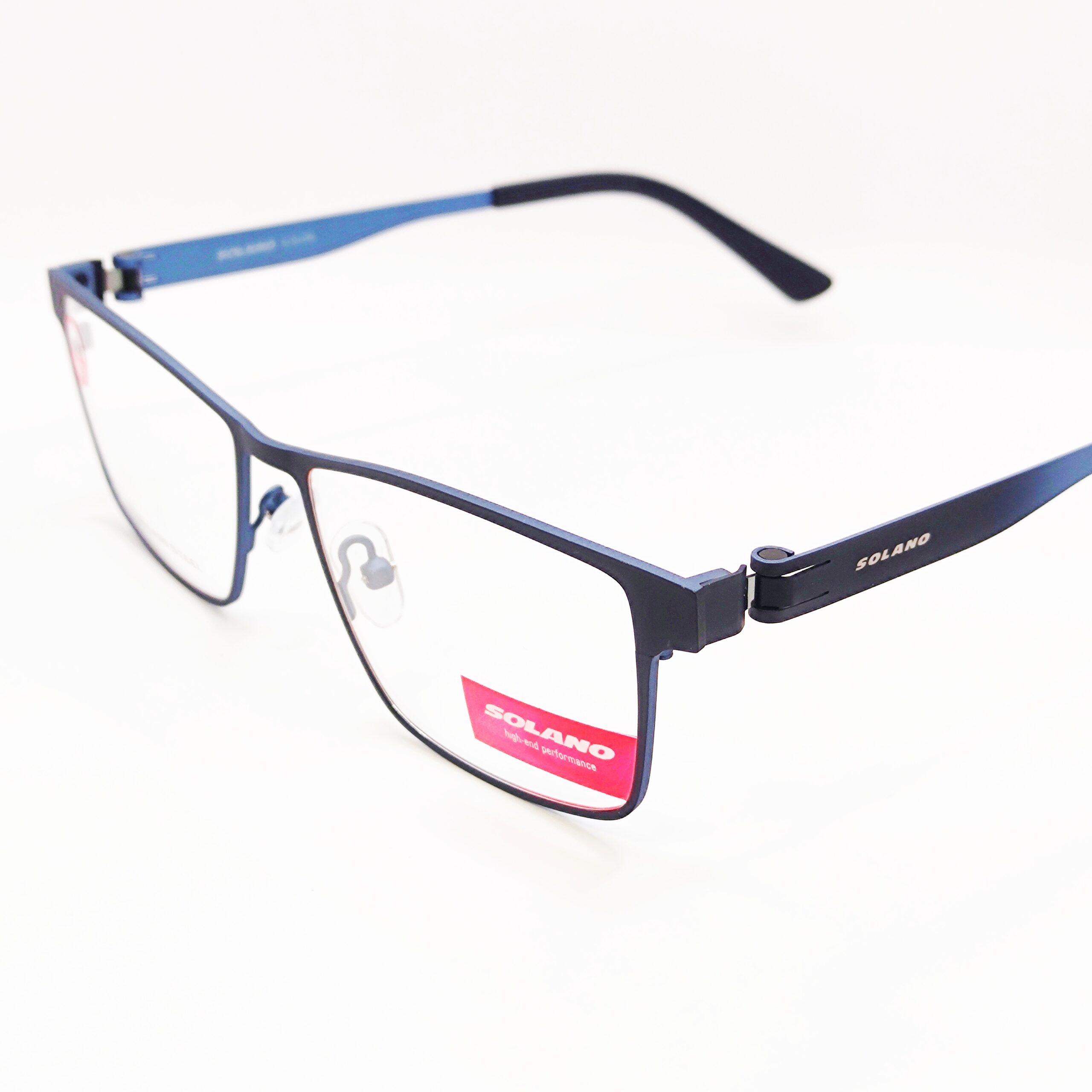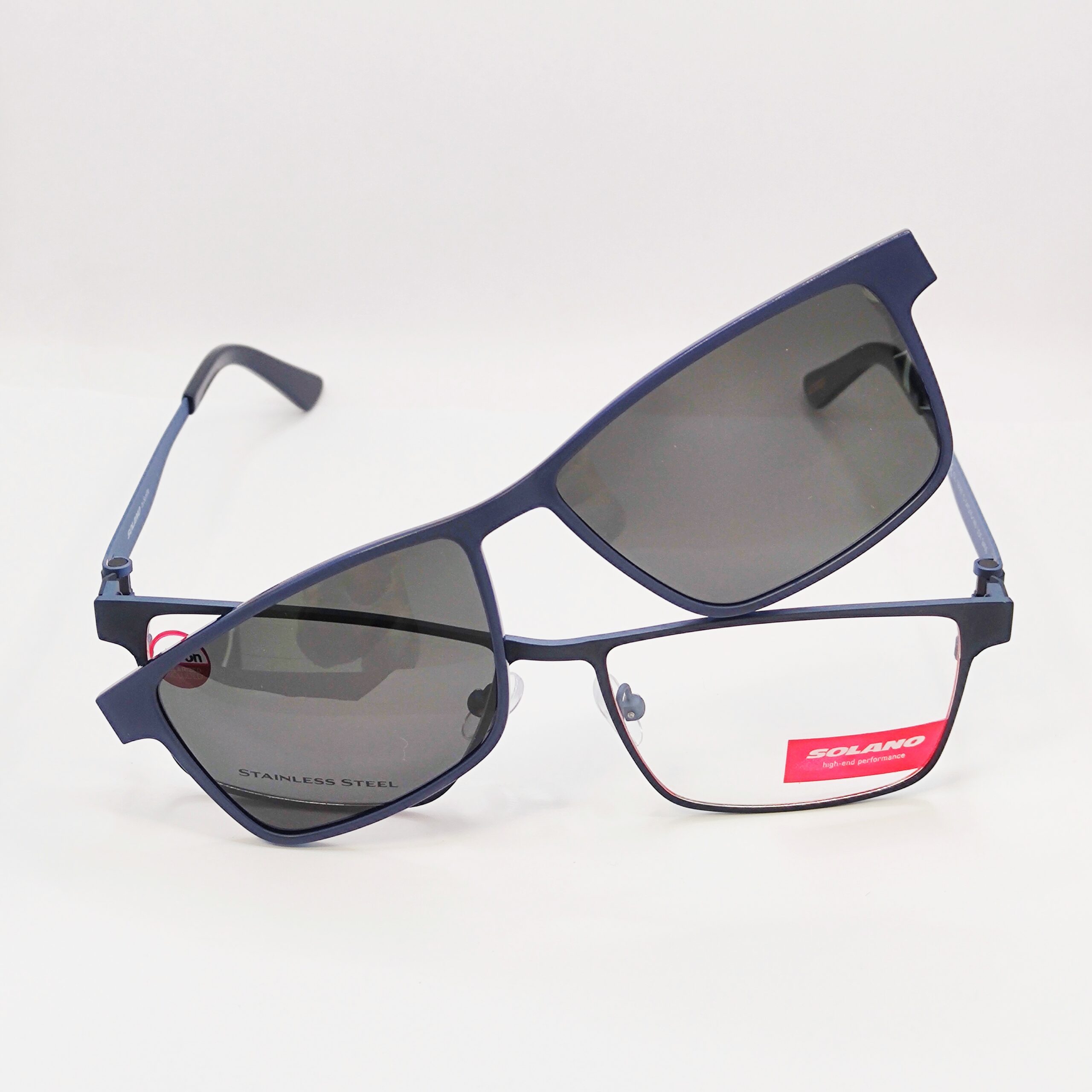 Korekcijski okvir znamke Solano s polariziranim clip-onom za sonce. Klasična oblika v modri barvi je pogosta moška izbira številka ena.