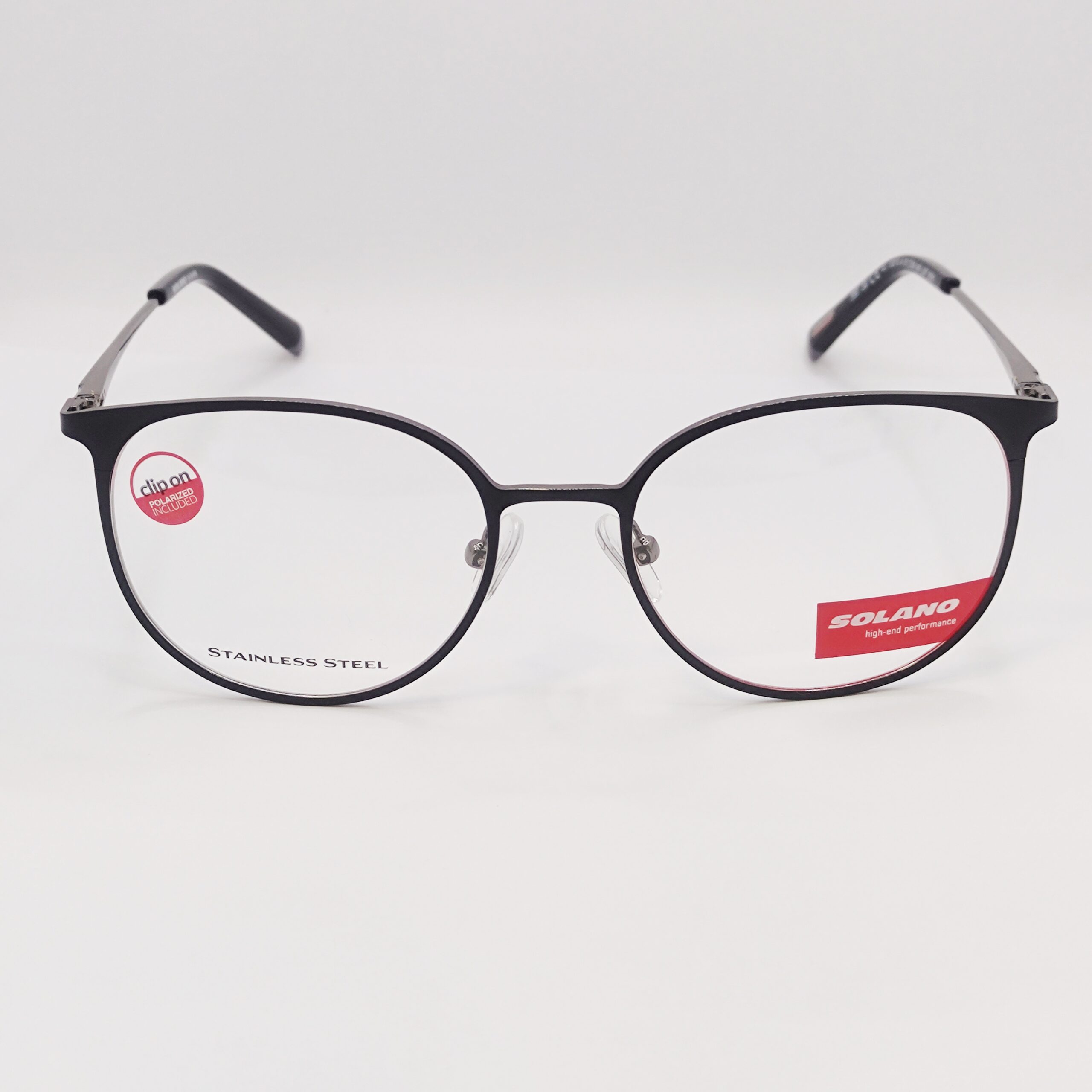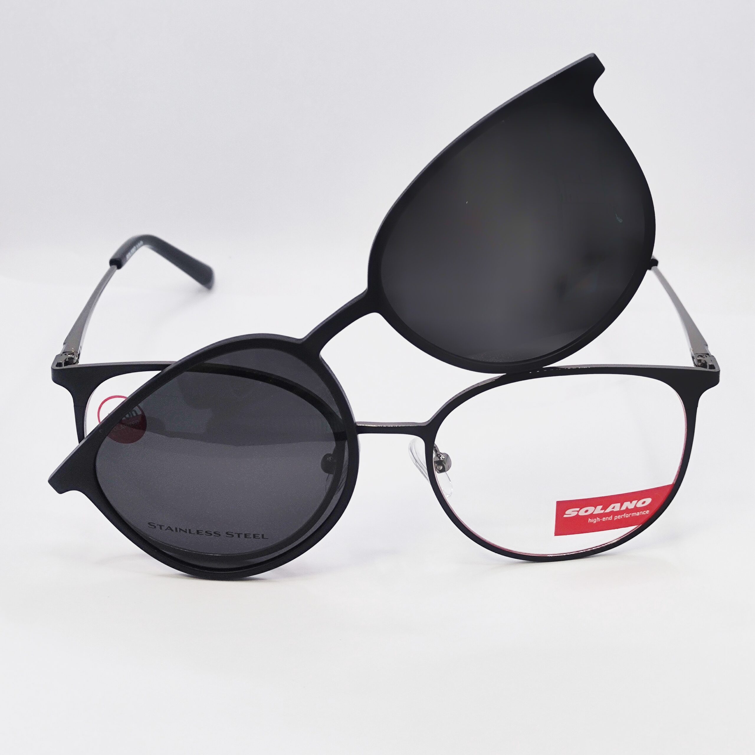 Korekcijski okvir znamke Solano s polariziranim clip-onom za sonce. Kombinacija črne in antracit sive barve.