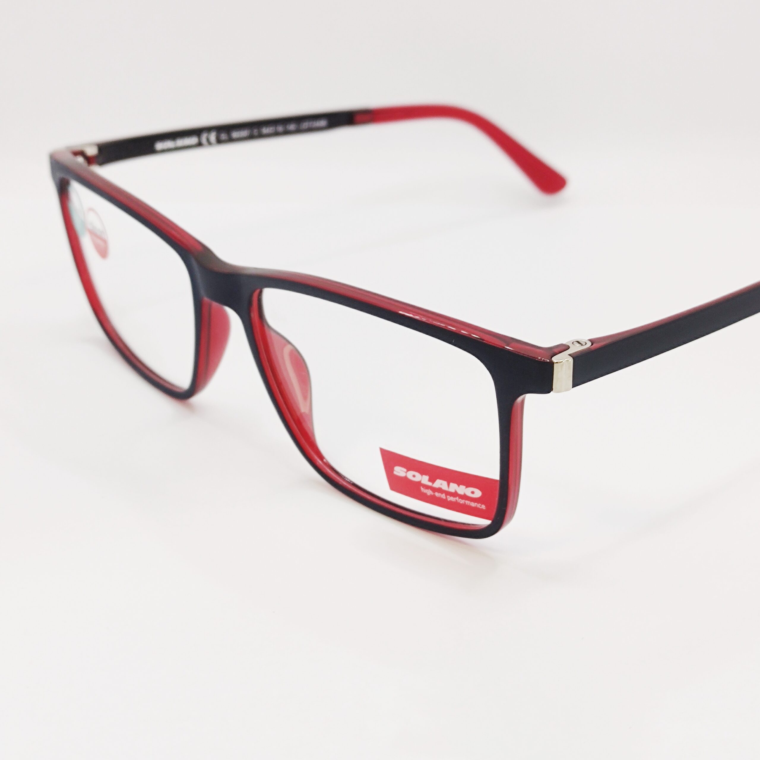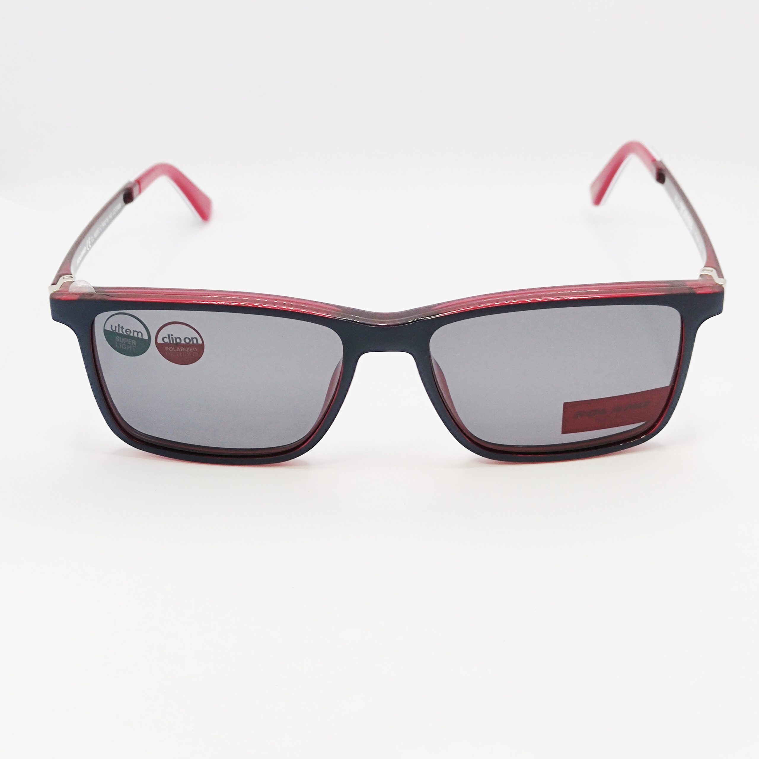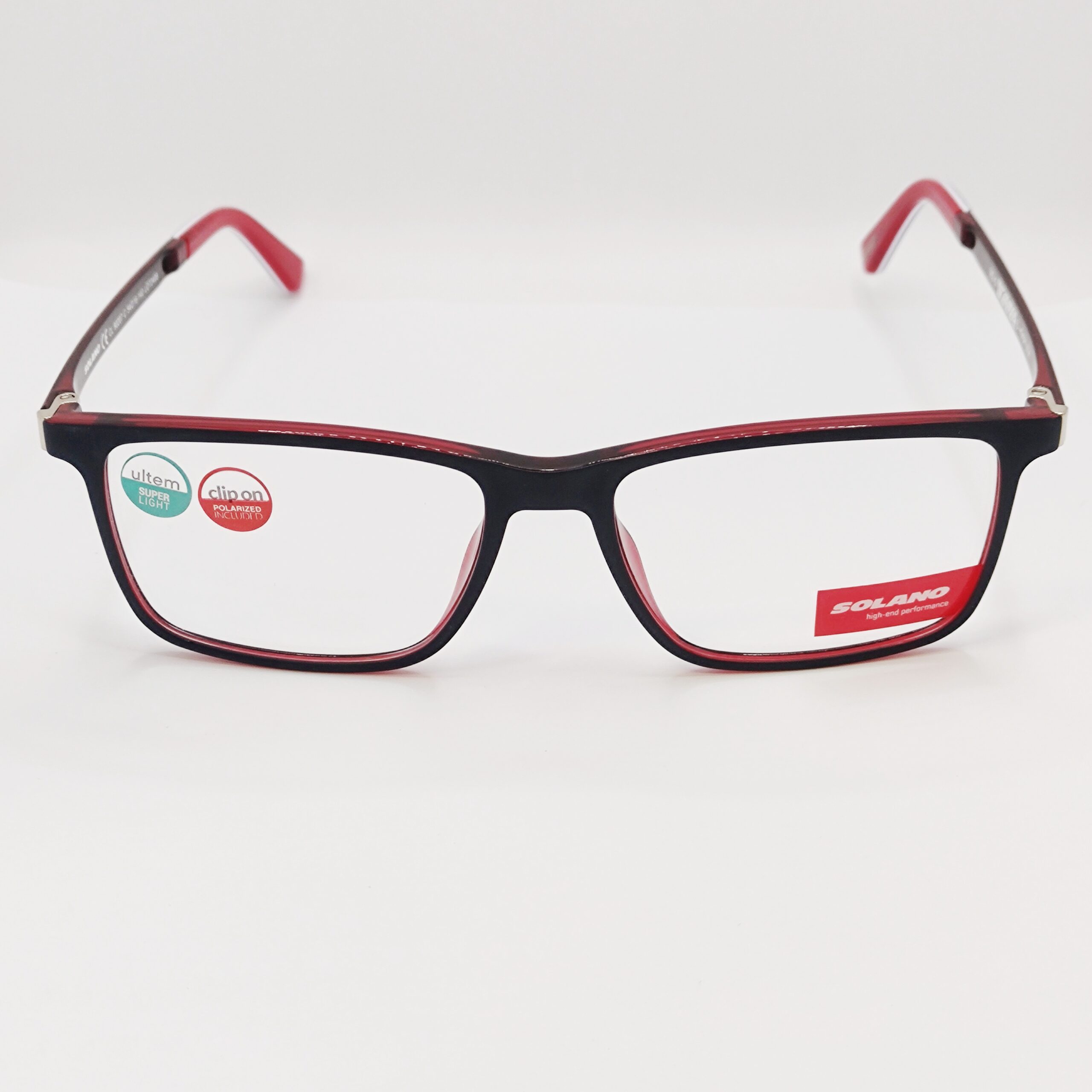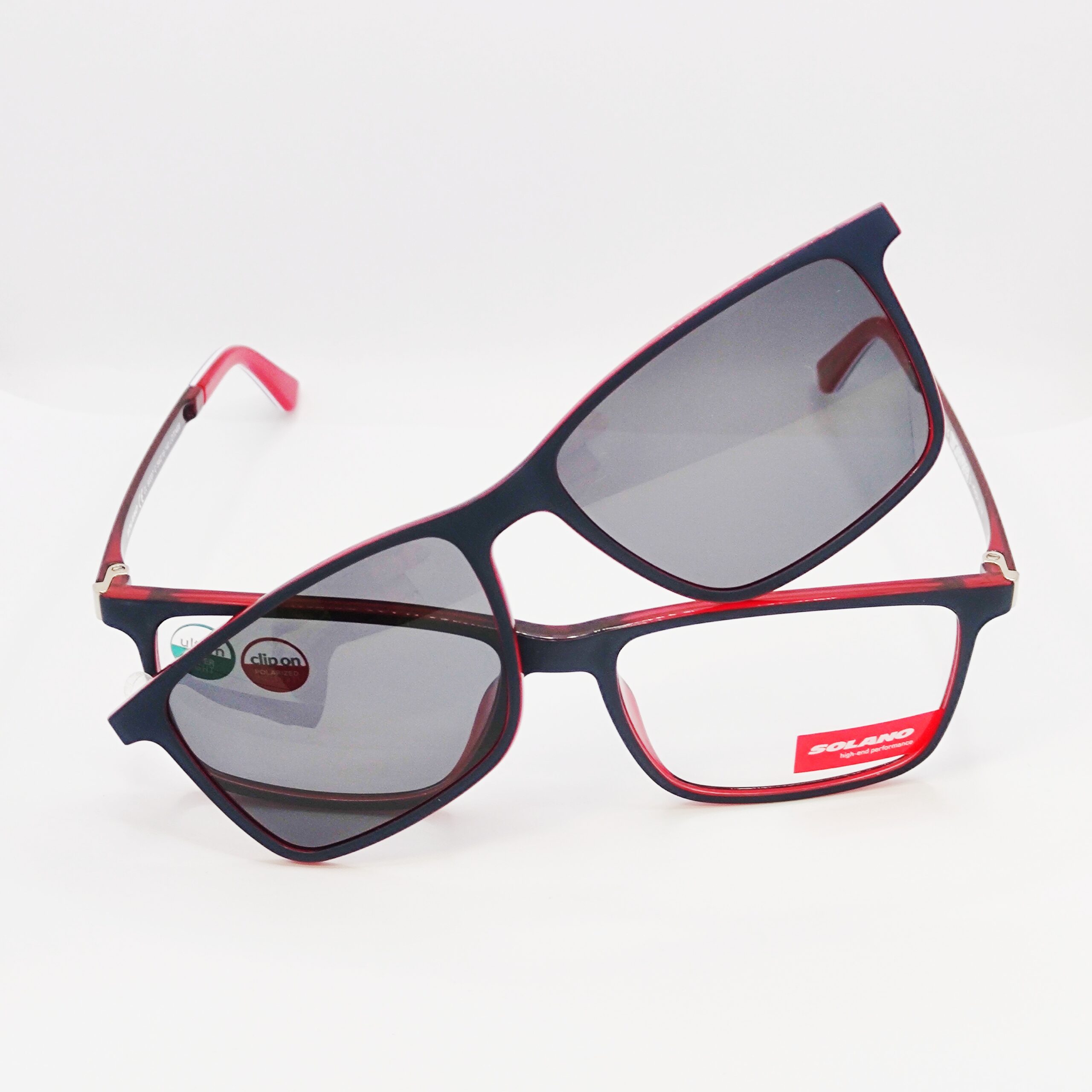 Korekcijski okvir znamke Solano s polariziranim clip-onom za sonce. Navduši s kombinacijo modre in rdeče barve.