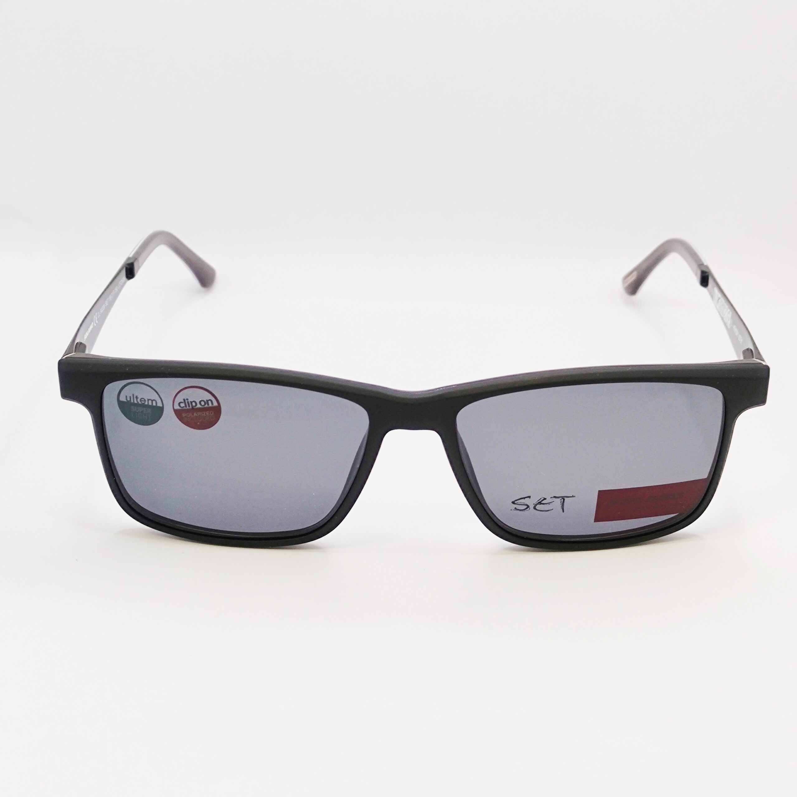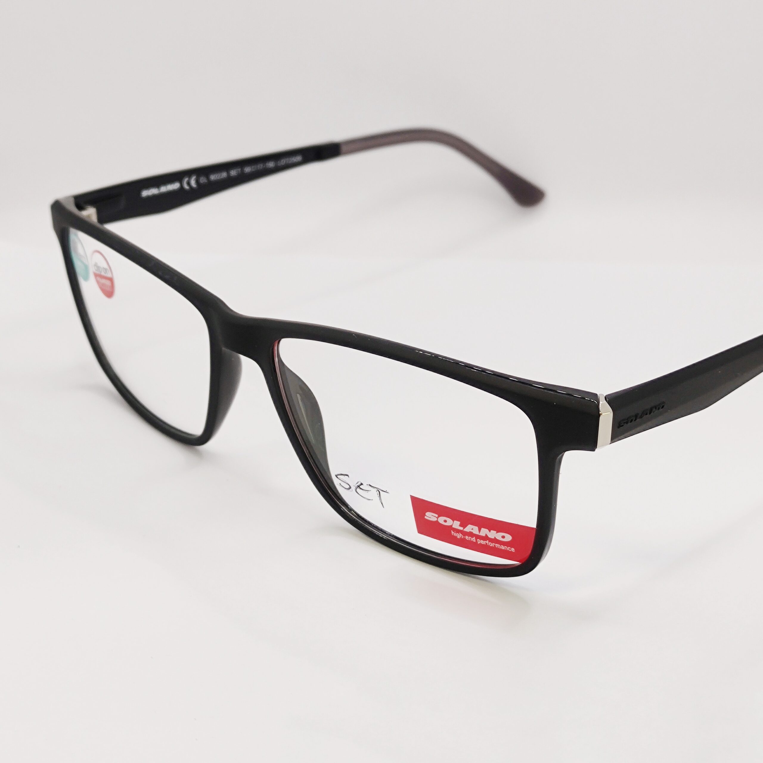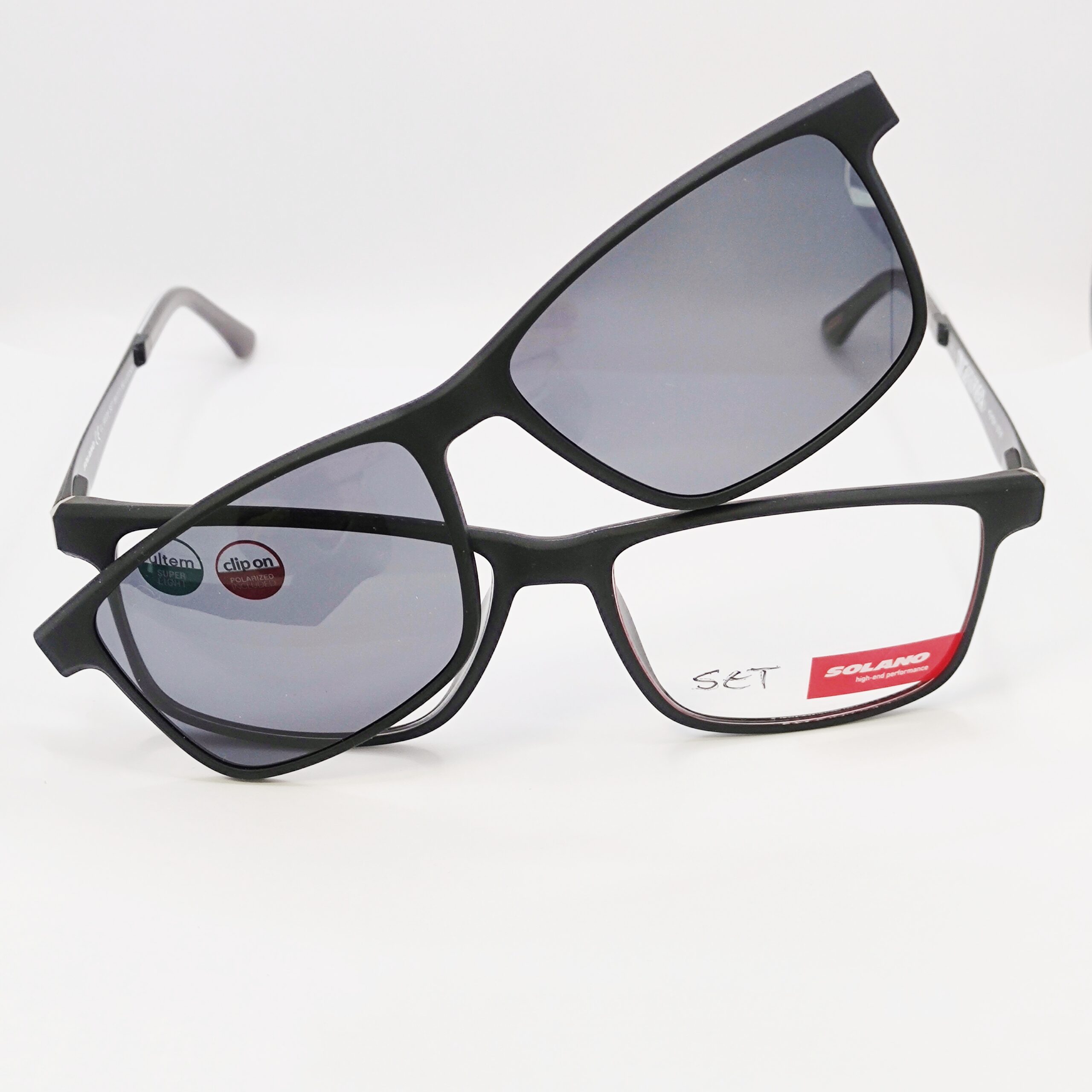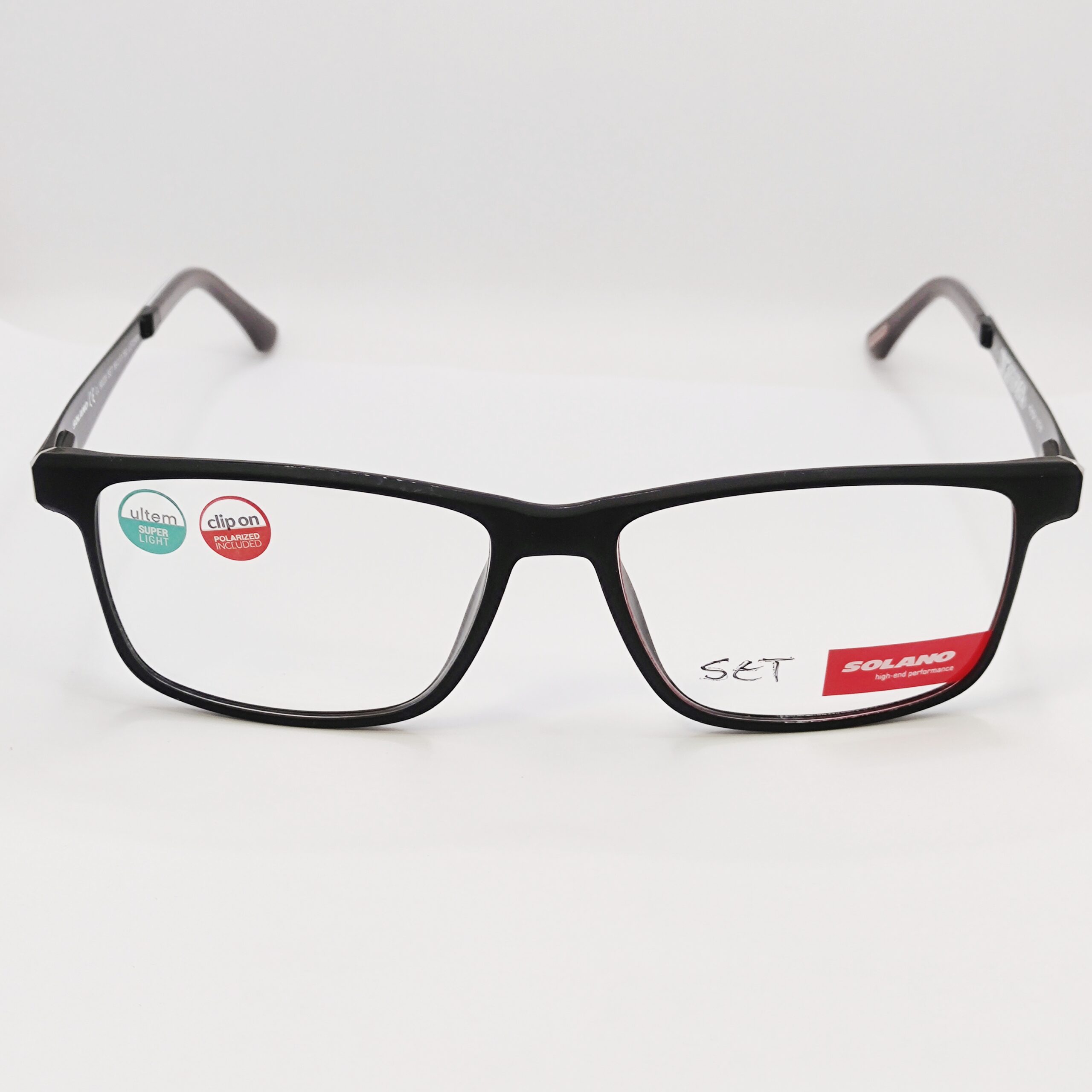 Korekcijski okvir znamke Solano s polariziranim clip-onom za sonce. Klasična oblika v črni barvi je pogosta moška izbira številka ena.