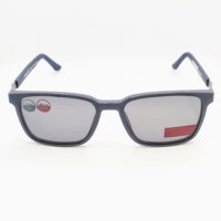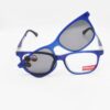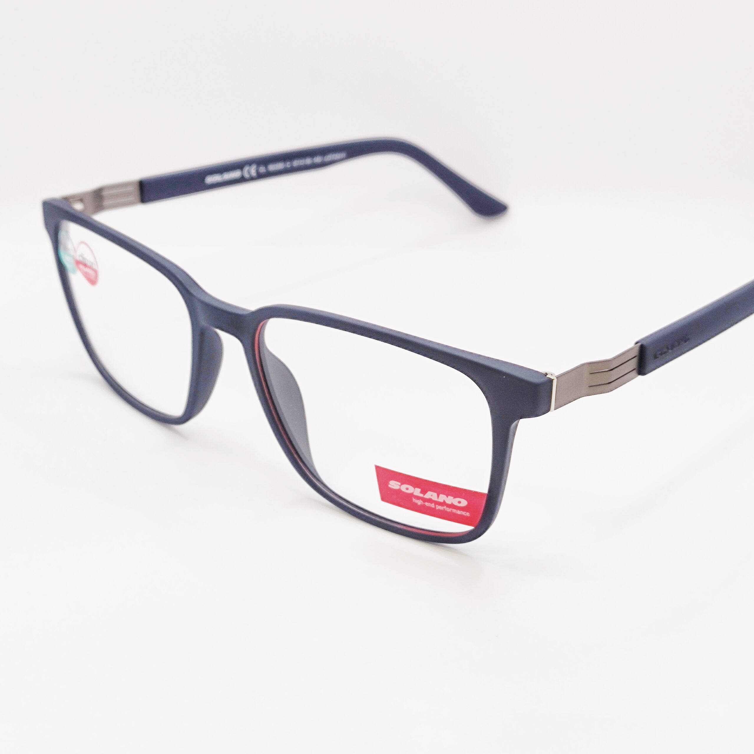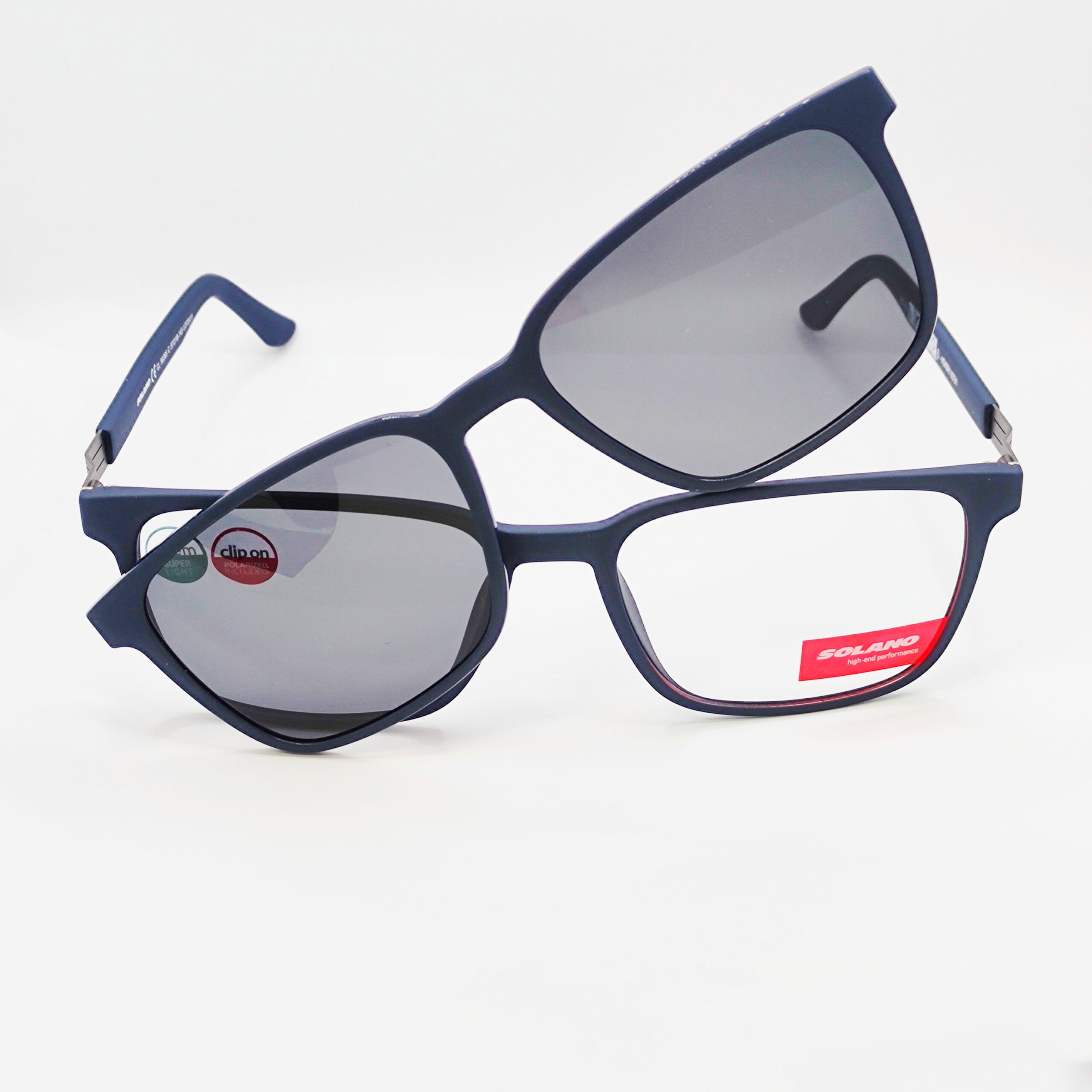 Korekcijski okvir znamke Solano s polariziranim clip-onom za sonce. Klasična oblika v modri barvi je pogosta moška izbira številka ena.